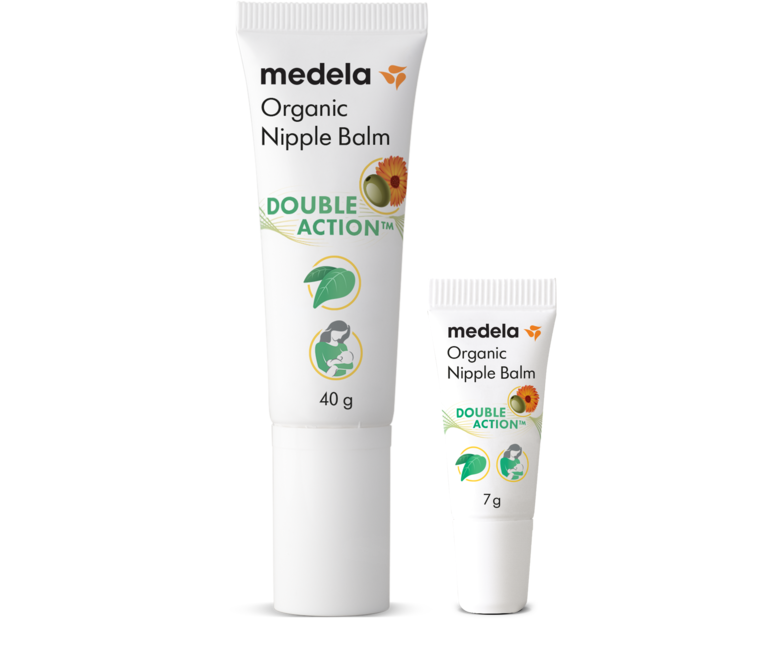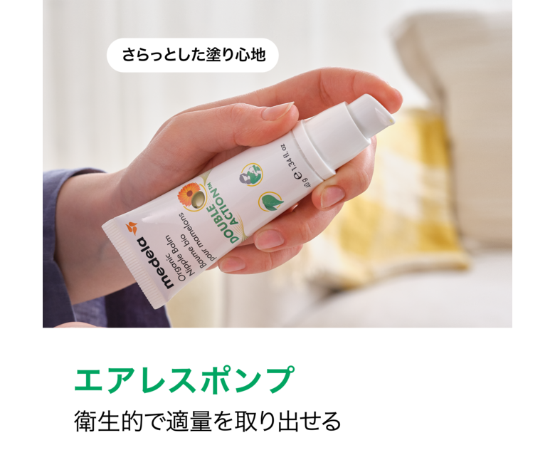 40gのボトルには、エアレスポンプを採用。空気に触れにくくすることで製品を酸化から守り、乾燥や変質、異物混入を防ぎます。ワンプッシュで乳頭ケアに必要な分だけ出てくるので無駄がありません。メデラのオーガニックニップルバームには40g入りと7g入りの2種類があります。(7g入りチューブは2024年春発売予定)